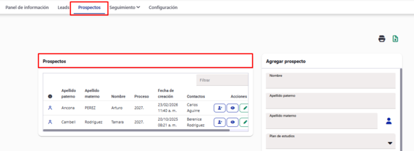 Ver: Podrá ver la información de los prospectos.