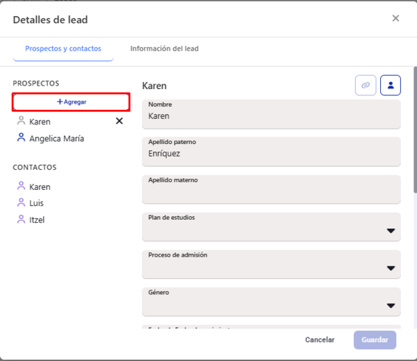 - Agregar/Modificar: Podrá agregar a nuevos prospectos y modificar la información de loe existentes.