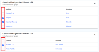 - Se te enviará a una pantalla con el listado de estudiantes de cada uno de los grupos que seleccionaste. Marca la casilla que se encuentra del lado izquierdo de su nombre para seleccionarlos.
