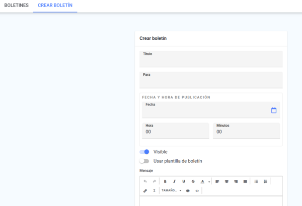 - Mensaje (requerido): Escribe el contenido del boletín, podrás dar formato al texto utilizando las funciones del editor de texto.