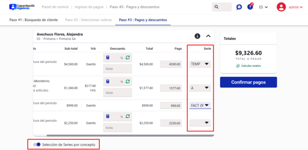 - Nota: Si estás registrando un pago parcial, primero deberás hacer clic en Calcular totales para actualizar los importes y luego proceder con Confirmar pagos.