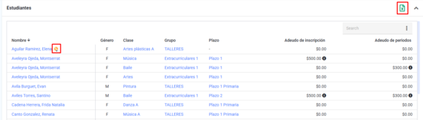 Nota: Si se muestra el ícono de extracurriculares enseguida del nombre del estudiante indica que fue inscrito fuera del módulo de extracurriculares, este listado se puede descargar en excel al hacer clic en el botón Descargar a excel ubicado en la esquina superior derecha de la tabla.