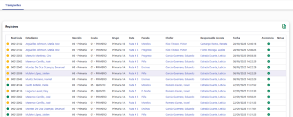 - Registro de salidas de transportes: Permite consultar la relación de registros a los estudiantes sobre el módulo de transportes.