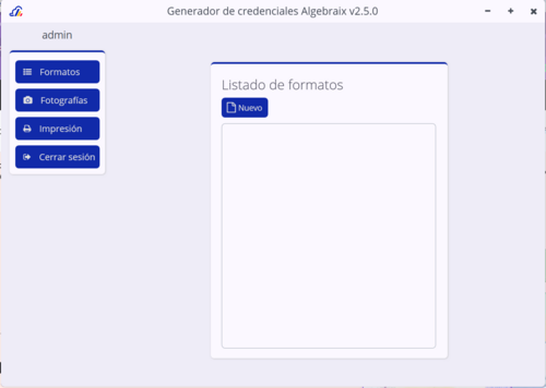 - Al ingresar al Generador de credenciales, visualizarás en el panel izquierdo las opciones de formatos, fotografías, impresión y cerrar sesión.