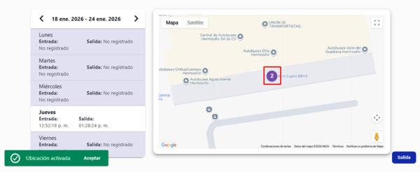 - Del lado derecho se muestra el mapa, donde, una vez realizado el registro de Entrada o Salida, se reflejará un círculo de color morado con un número que indica el tipo de registro: