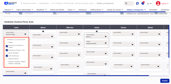- Salidas: Permite el acceso a todas las opciones del menú salidas y transportes en el perfil del estudiante.