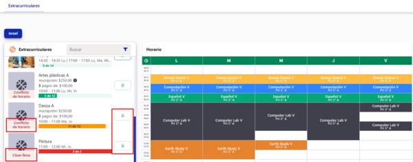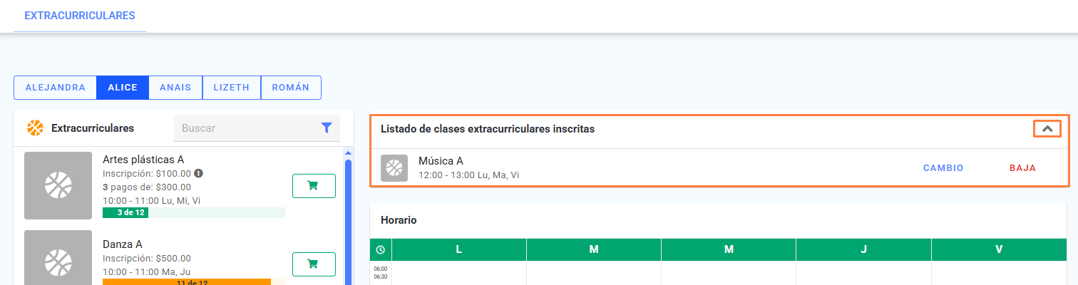 - Del lado derecho, arriba de la tabla de horario del estudiante encontrarás un filtro llamado Listado de clases extracurriculares inscritas.
