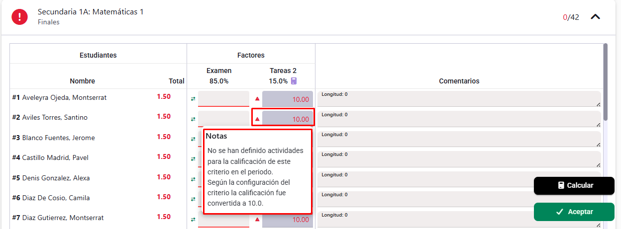- Factores: Se muestran los criterios de evaluación que fueron configurados en la clase y en los que necesitas agregar una calificación.