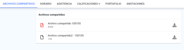 - Haz clic en la pestaña de Archivos compartidos. Ahí podrás ver todos los archivos que se le hayan compartido al estudiante de manera individual y que estén configurados como visibles para los profesores.